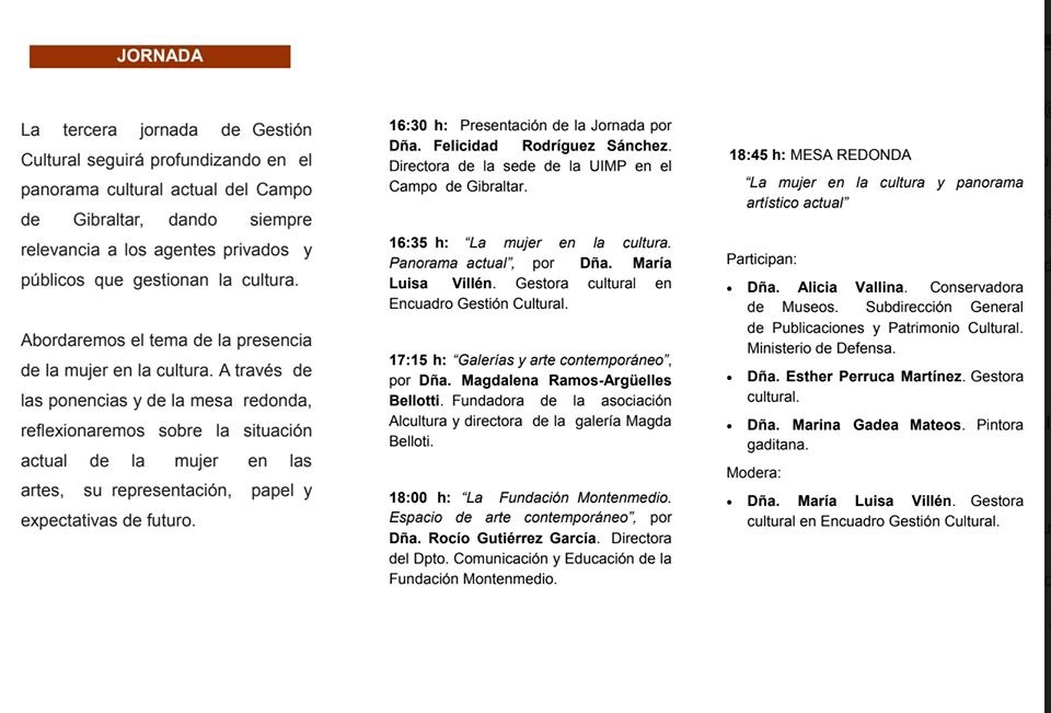 En colaboración con la UIMP y con Encuadro Gestión Cultural, hemos organizado la tercera jornada de Gestión Cultural que seguirá profundizando en el panorama cultural actual del Campo de Gibraltar, dando siempre relevancia a los agentes privados y públicos que gestionan la cultura.