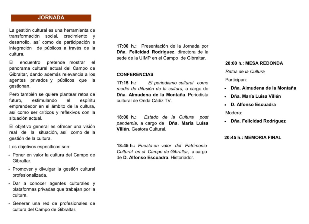 La primera conferencia, será a cargo de Almudena de la Montaña, periodista cultural de Onda Cádiz TV, que hablará sobre el periodismo cultural, como medio de difusión de la cultura.